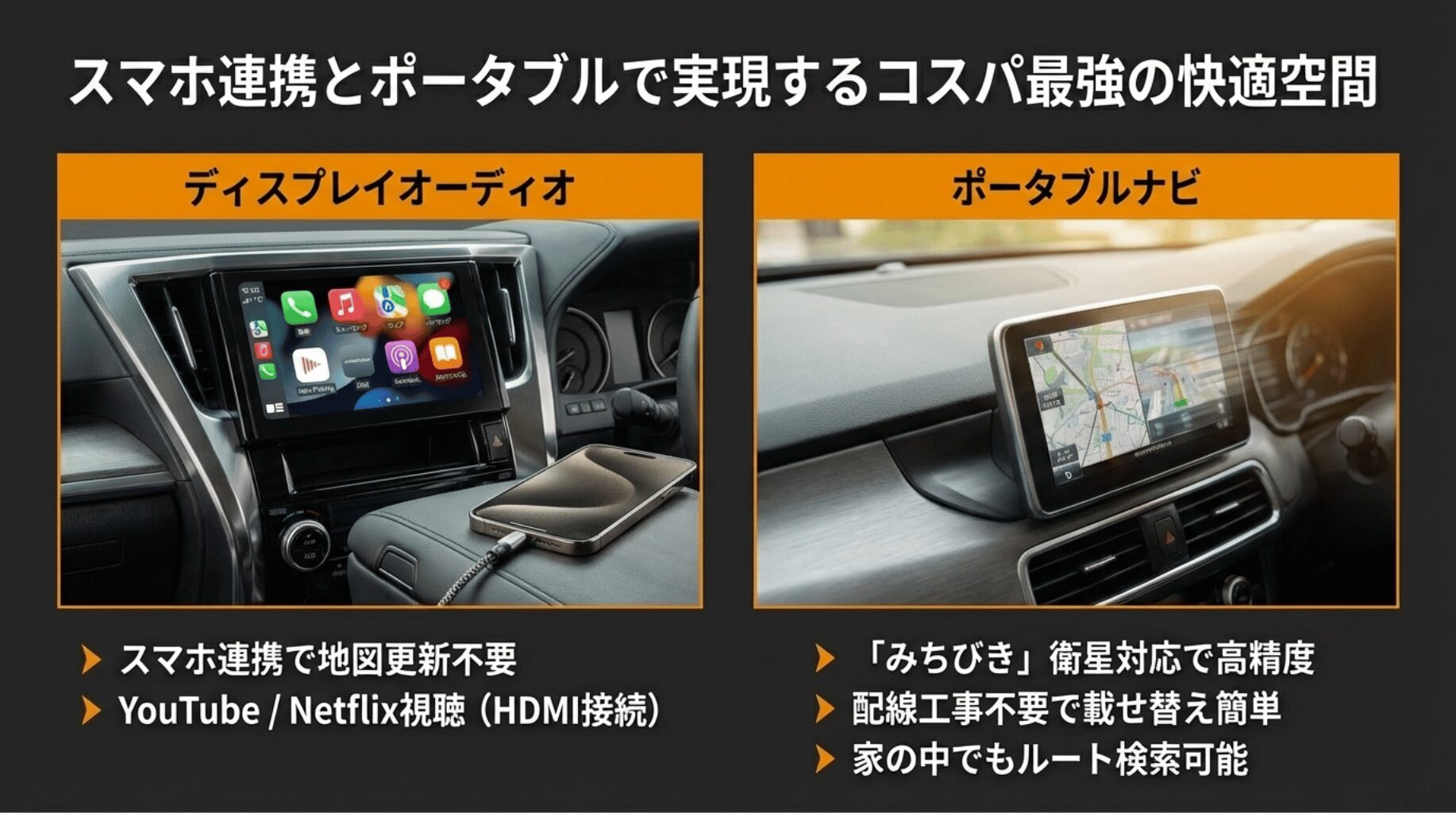 近年、若年層を中心に爆発的に普及しているのが、ナビ機能を持たない「ディスプレイオーディオ(DA)」です。これはスマートフォンの機能を車載ディスプレイに映し出すことを前提としたユニットで、Apple CarPlayやAndroid Autoと連携させて使用します。スマホで使い慣れたGoogleマップやYahoo!カーナビがそのまま画面に表示されるため、地図更新の手間や費用が一切かからないという圧倒的なメリットがあります。