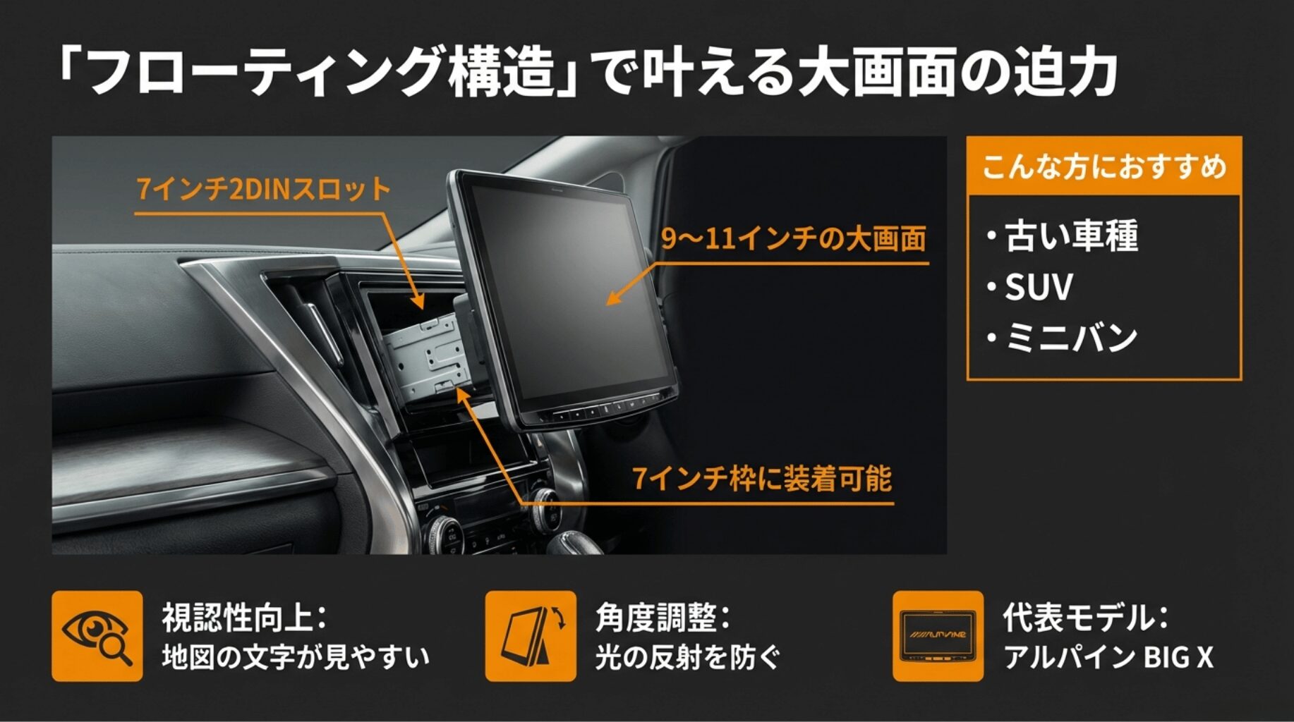 - 本来は大型ナビ非対応の車種でも9〜11インチが装着可能