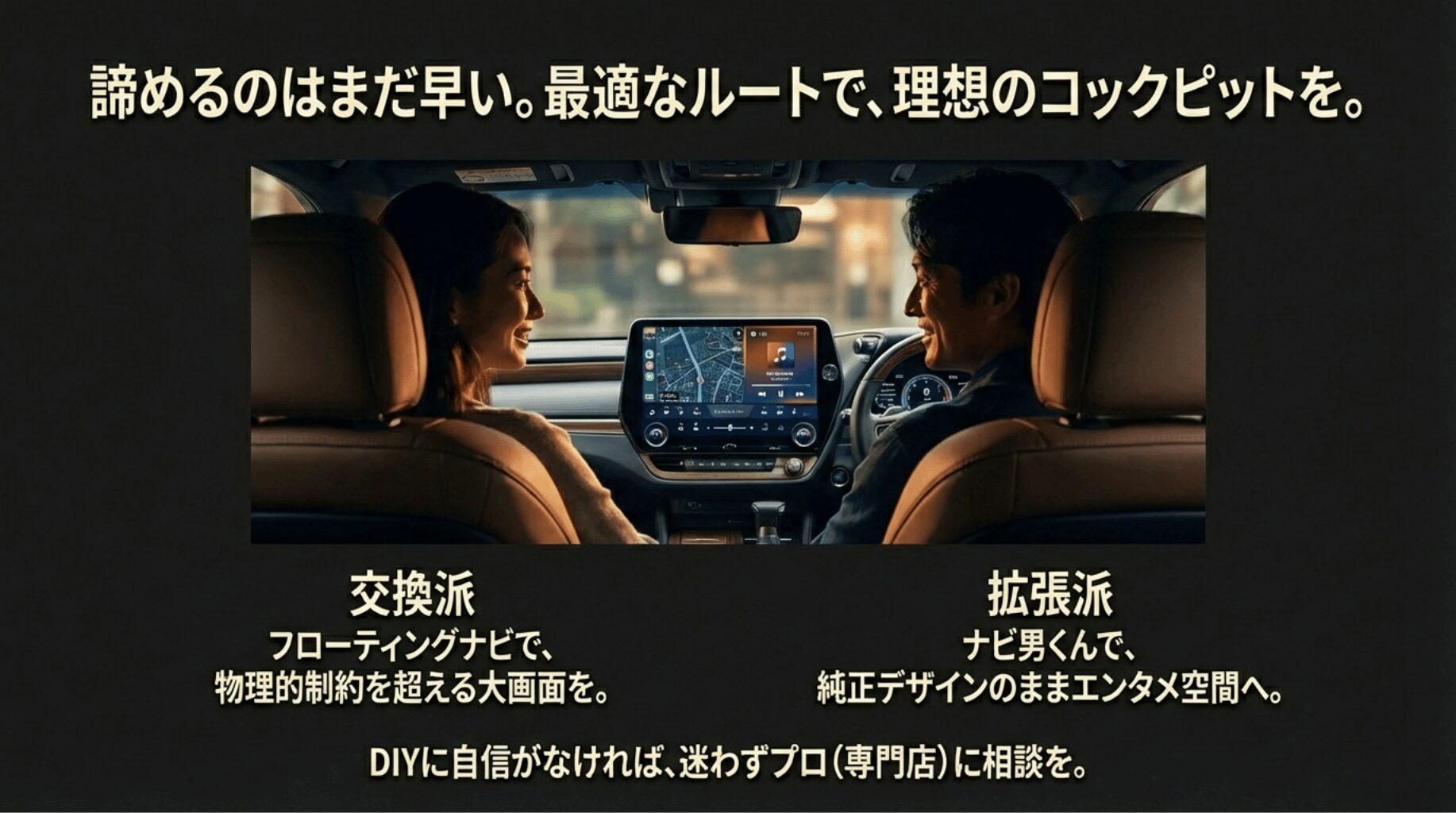 さて、ここまで「カーナビの大画面を後付けする」ための様々なアプローチを解説してきましたが、いかがでしたでしょうか。今の車を取り巻く環境は、かつてのように「合わないから諦める」のではなく、「どうやって拡張するか」を考える時代へとシフトしています。もし、あなたの車がナビ本体を交換できるタイプであれば、アルパインやパナソニックの11インチ級フローティングナビを迷わず導入すべきです。その広大な画面がもたらす安心感とワクワク感は、間違いなく毎日のドライブを彩ってくれます。