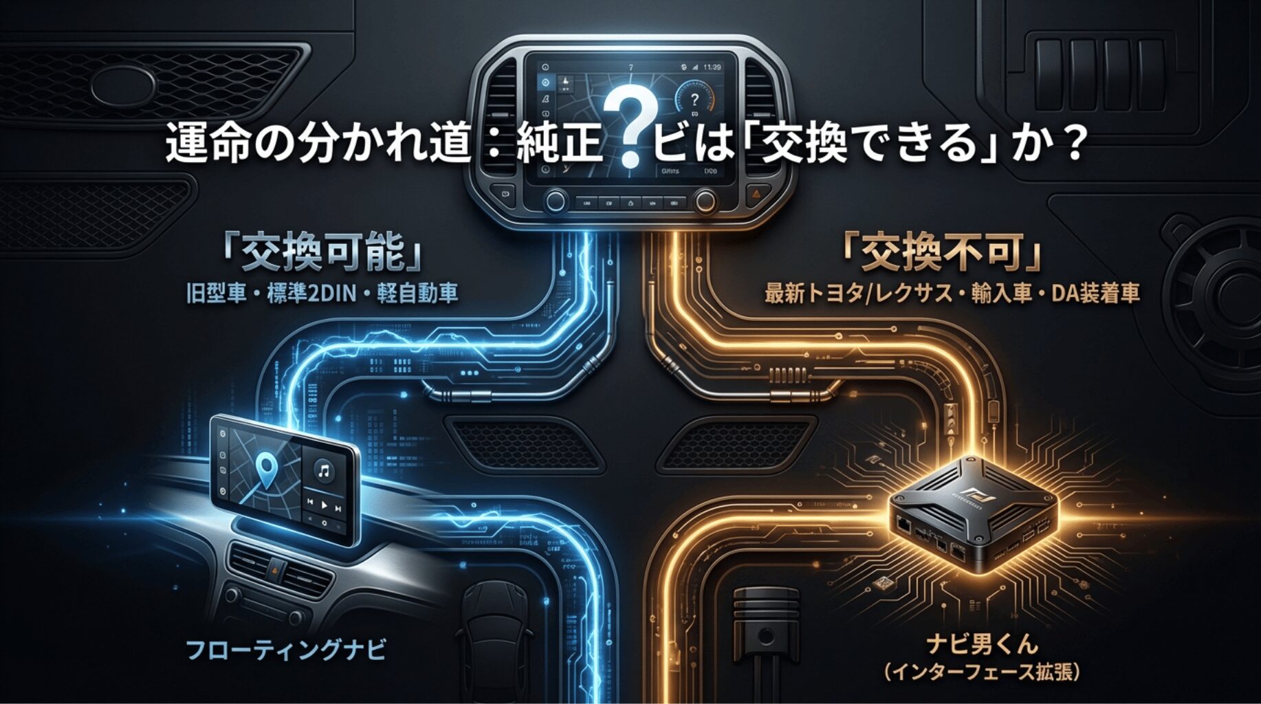 純正ナビ一体型の車両の場合、無理に本体を交換しようとするのではなく、後述する「ナビ男くん」のような外部インターフェースを使った拡張を検討するのが賢明です。量販店はあくまで「汎用品の取り付け」を得意とする場所であり、特殊な車両システムへの深い介入は専門外である場合が多いことを理解しておきましょう。