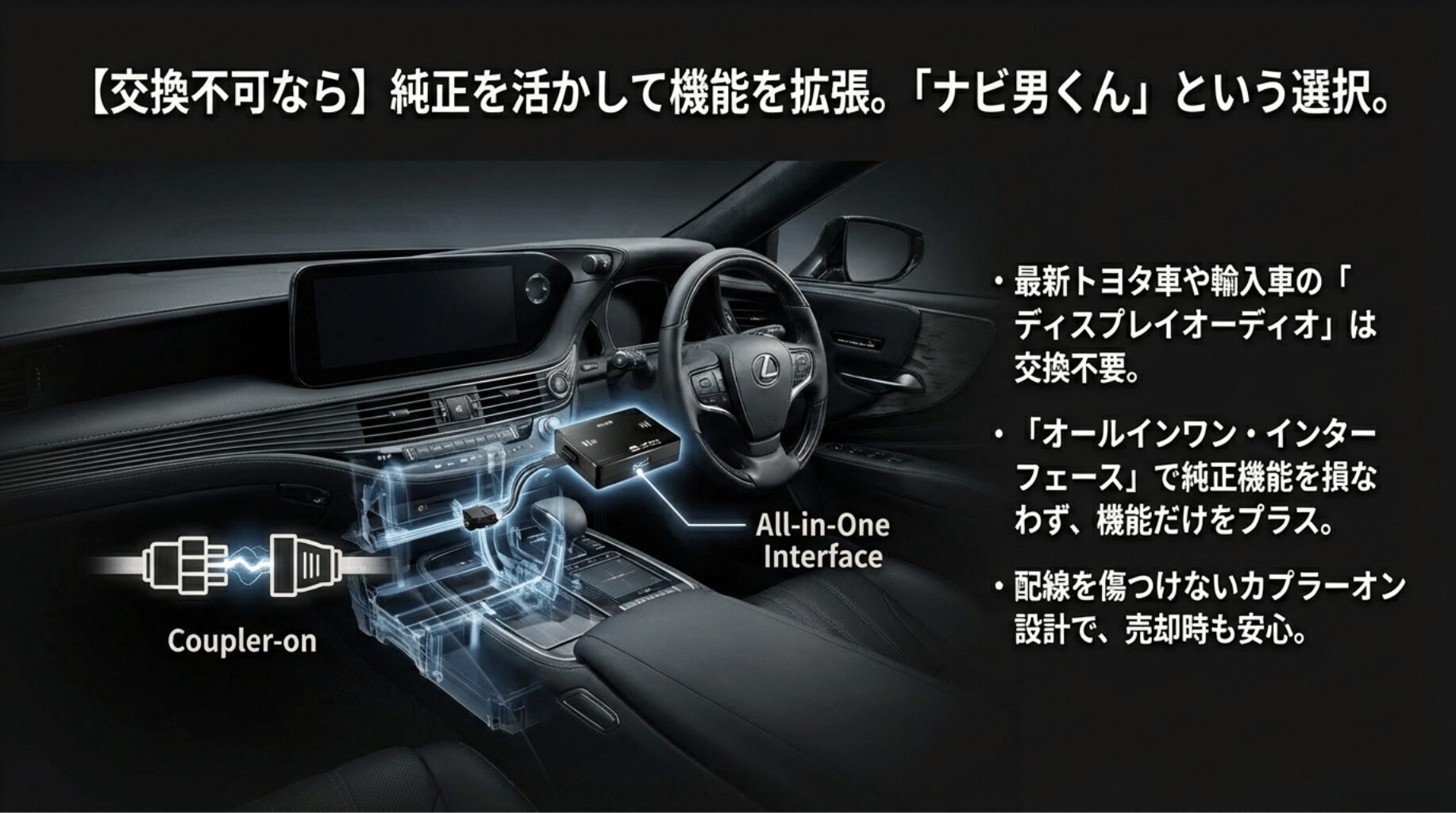 さて、ここまでは「古いナビを外して新しい大画面ナビに付け替える」話をメインにしてきました。しかし、読者の中には「うちの車はトヨタの最新モデルで、ナビを外そうとしたらディーラーに止められた」という方も多いはず。そんな方々にこそ知ってほしいのが、電装界のカリスマ的存在である「ナビ男くん」のソリューションです。