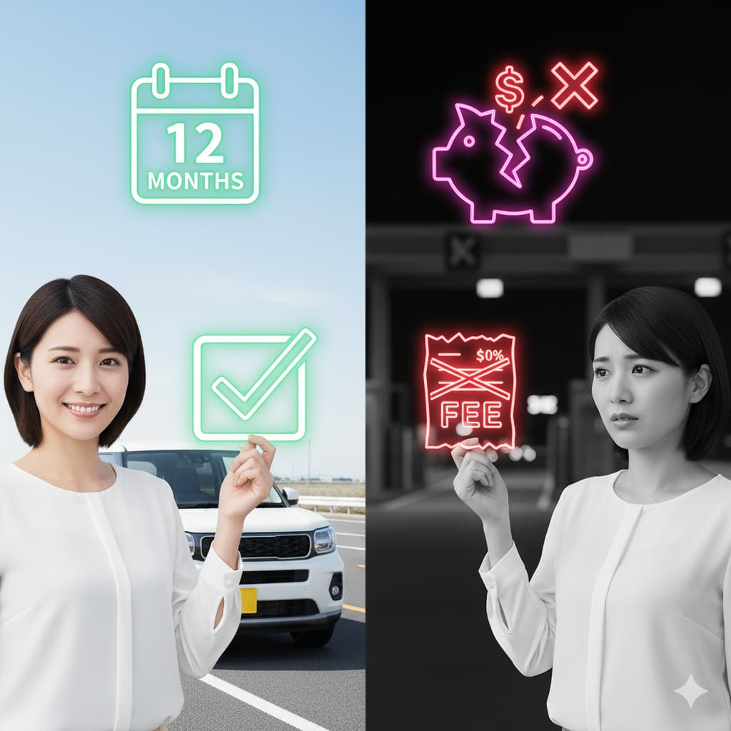 さらに重要なのが中途解約のリスクです。KINTOの解約金フリープランは、申込金(実質月額5ヶ月分)を支払うことで、1年未満であっても解約金0円が保証されます。一方で、他社の「1年契約」を結んだ場合、その1年という期間内(例えば10ヶ月目)で解約しようとすると、残りの期間分(2ヶ月分)のリース料全額や、高額な違約金を請求されることが一般的です。「1年契約」は、1年間きっかり利用することが大前提となっています。