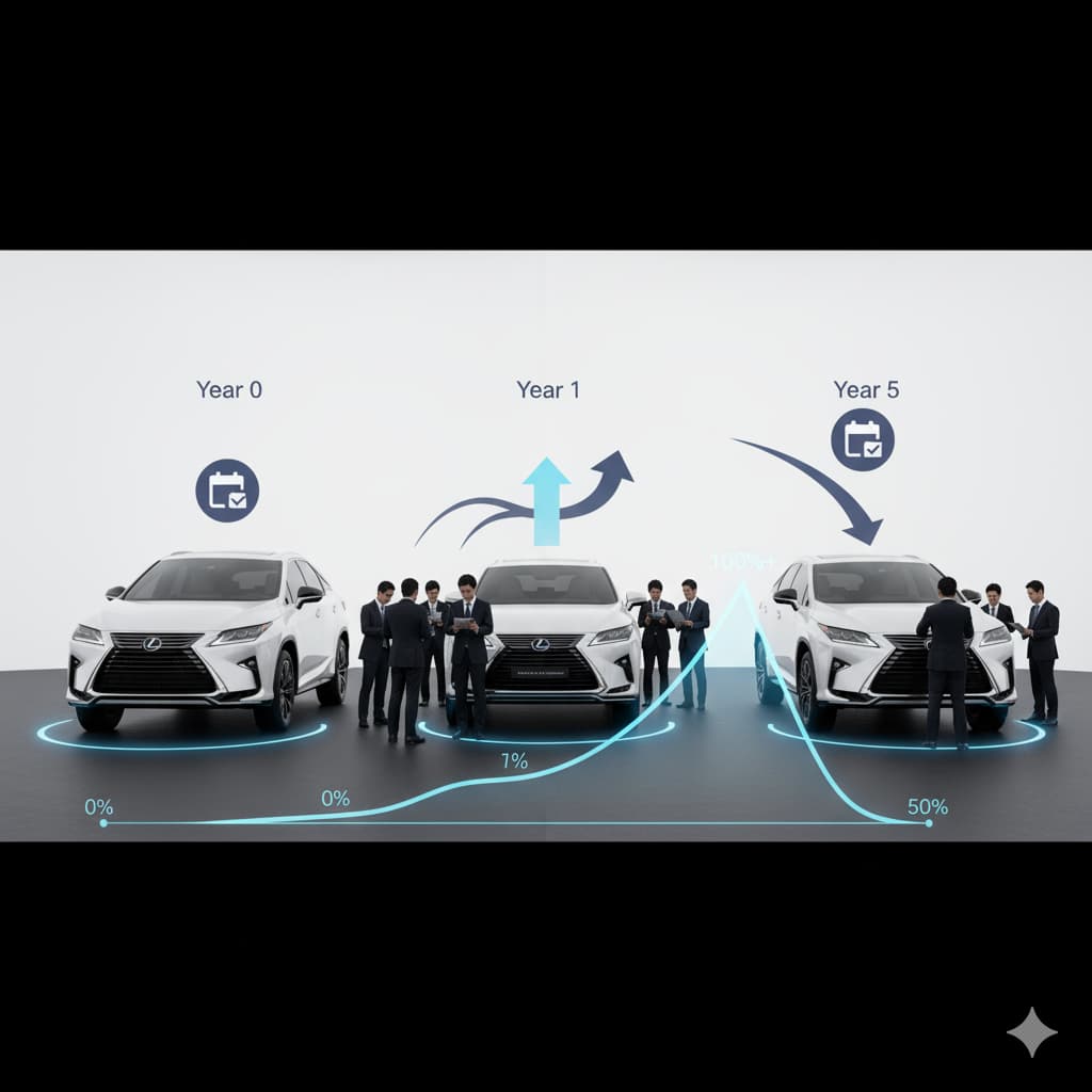 レクサスRXの資産価値を最大限に活かすためには、購入時の仕様選びだけでなく、どのタイミングで手放すか、すなわち「年式」を意識した売却戦略が極めて重要になります。