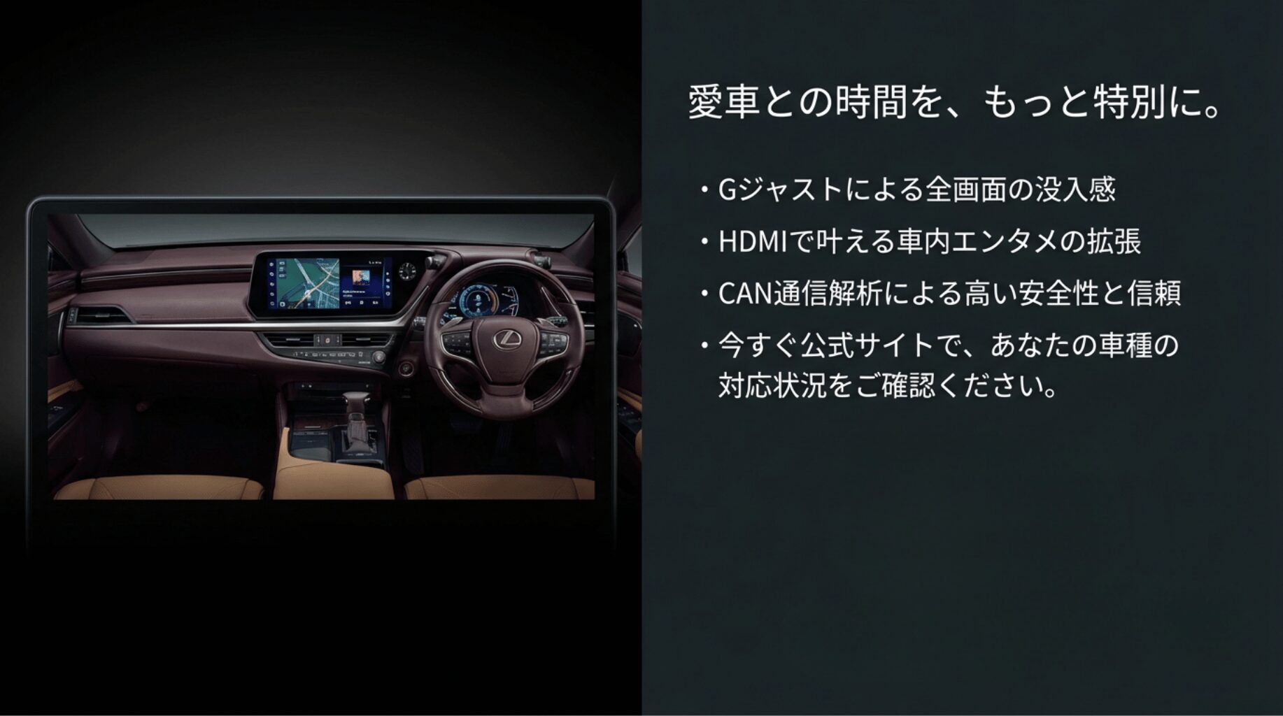 - 純正ナビの画面をフル活用できる唯一無二の表示技術「Gジャスト」