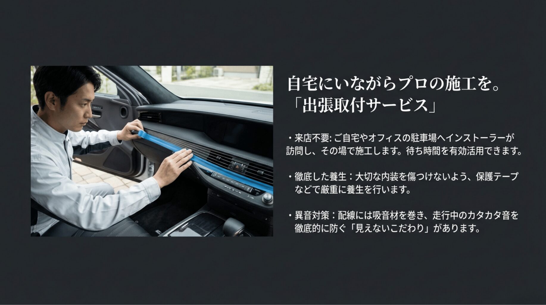 ナビ男くんを語る上で欠かせないのが、全国規模で展開されている「出張取付サービス」です。通常、電装品の取り付けは店舗に車両を持ち込み、作業終了まで近隣のカフェや待合室で時間を潰すのが一般的です。しかし、ナビ男くんの出張取付を利用すれば、自宅の駐車場や契約ガレージ、さらには勤務先の駐車場にインストーラーが直接訪問し、その場で施工を完結させてくれます。この圧倒的な利便性が、多忙なエグゼクティブや子育て世代のオーナーから非常に高い評判を得ています。