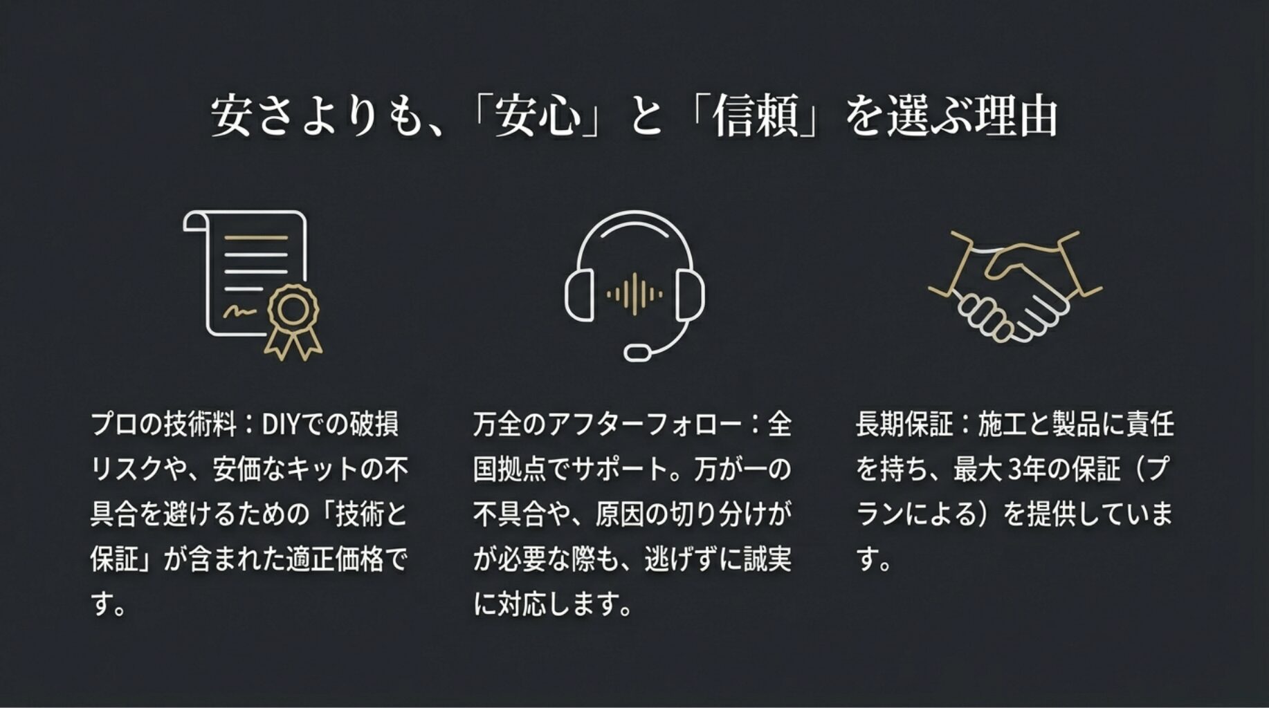 | 保証体制 | 自社施工・自社製品保証 | メーカー保証準拠 |