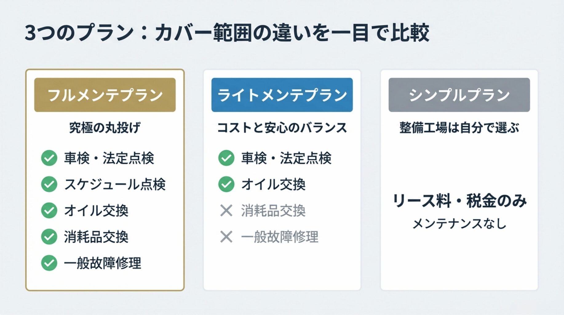 - 3種類あるメンテナンスプランの具体的な役務範囲と料金の違い