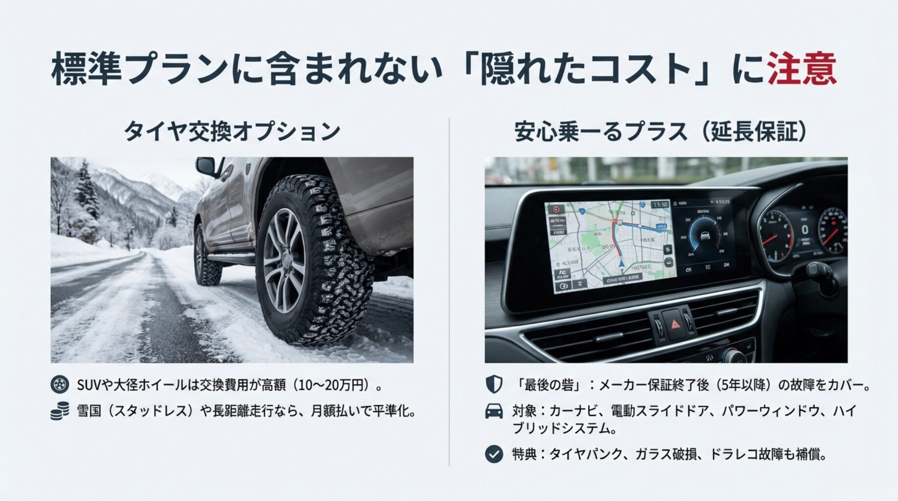 特に、修理費用が跳ね上がりやすい輸入車や、複雑なハイブリッドシステムを搭載したSUVを検討している方には、必須級のオプションと言えるでしょう。修理代の不安を抱えながら乗るよりも、月々数百円から数千円の追加でこの安心を手に入れられるのは、非常にコストパフォーマンスが高いと言わざるを得ません。走行距離が長い方ほど、故障リスクは高まるため、長期契約を検討中なら優先的に検討すべきです。