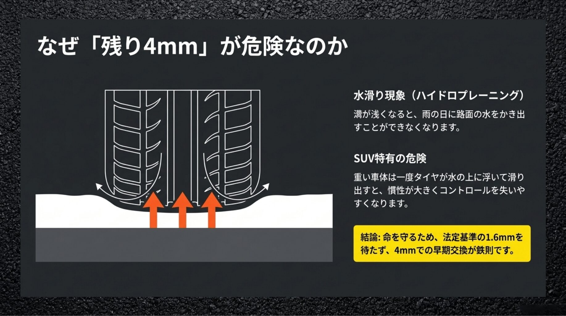 溝が浅くなることで発生するハイドロプレーニング現象と、SUV特有の慣性による危険性を解説した図。