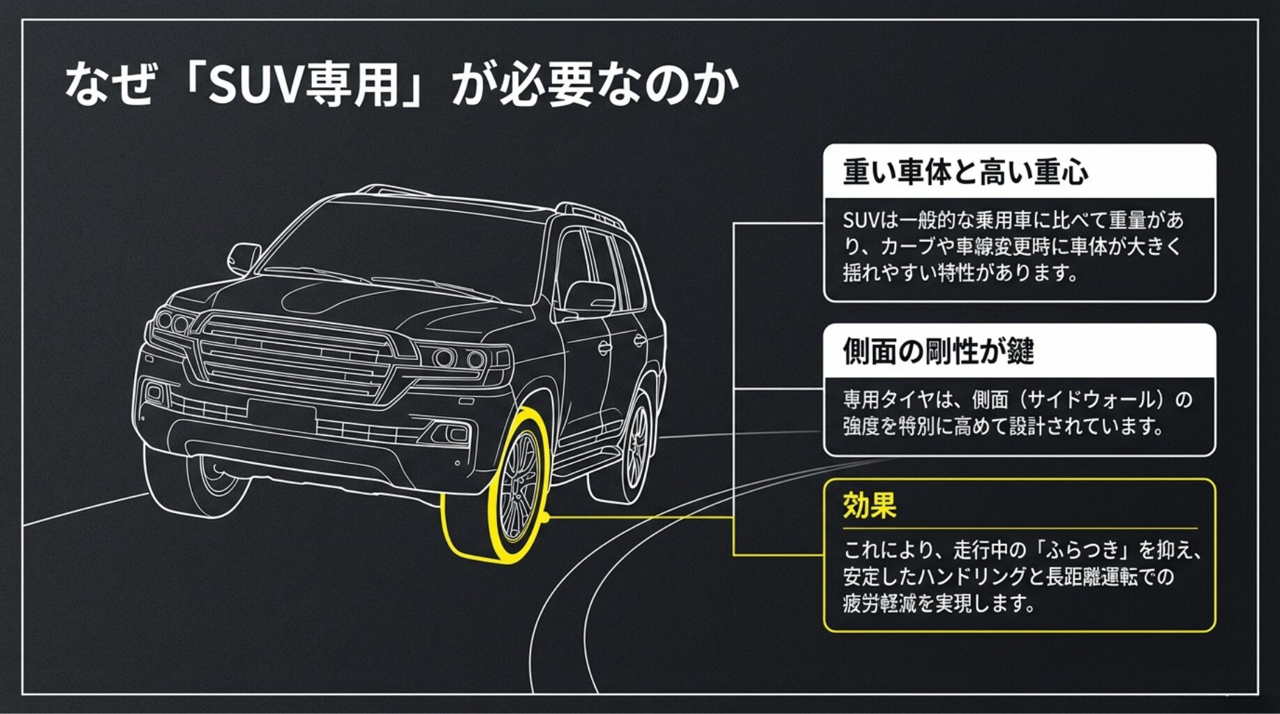 SUVの重い車体と高い重心によるふらつきを抑える、サイドウォール(側面)剛性の重要性を解説する図解。