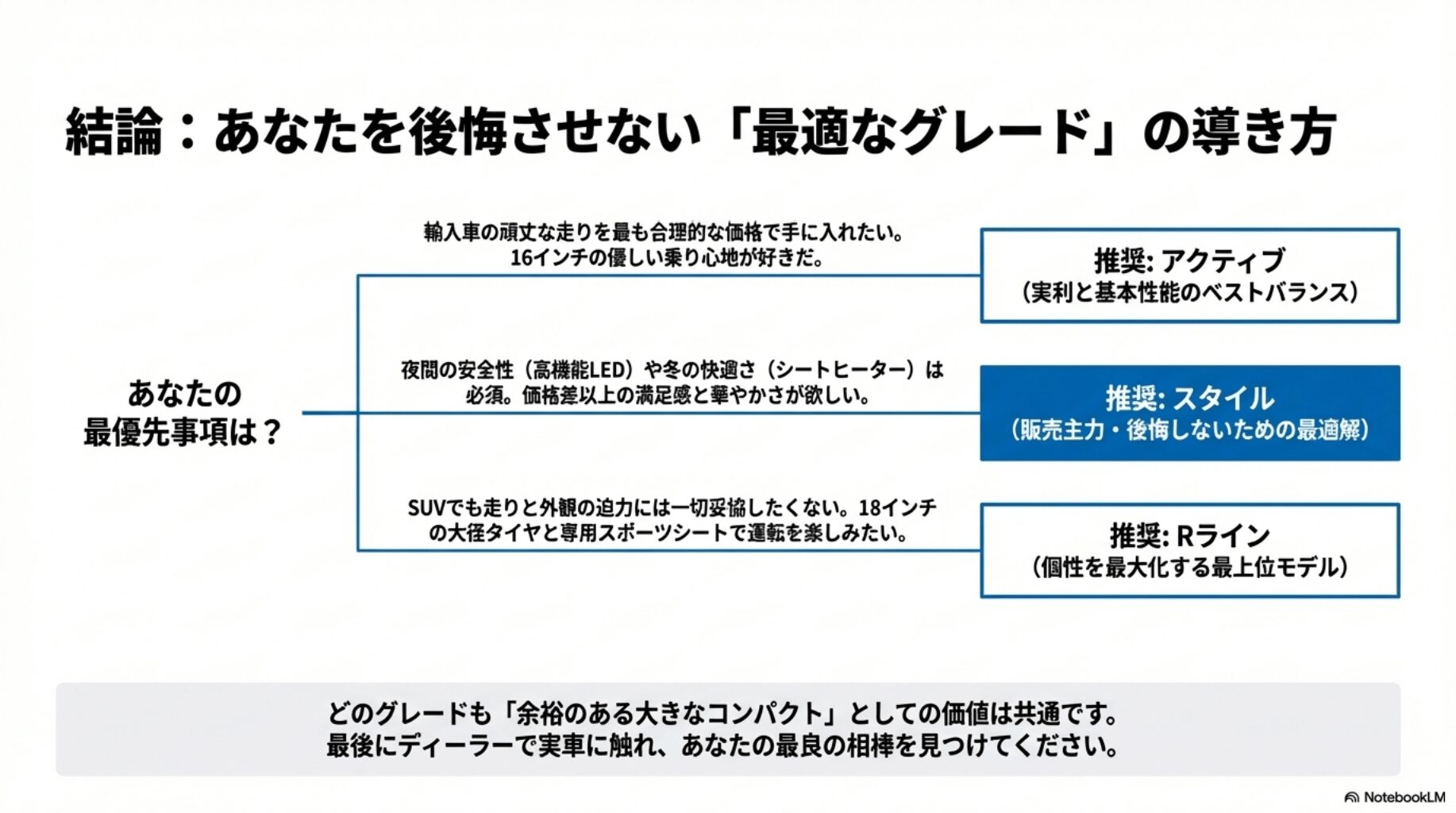 長々と解説してきましたが、最終的にどのグレードを選ぶかは、あなたが車に求める「一番の優先順位」によって決まります。今回のマイナーチェンジによって、T-Crossはどのグレードを選んでも「高い安全性」と「クラスを超えた質感」を手に入れられるようになりました。最後に、検討の決定打となるグレード別の推奨ユーザー像をまとめます。