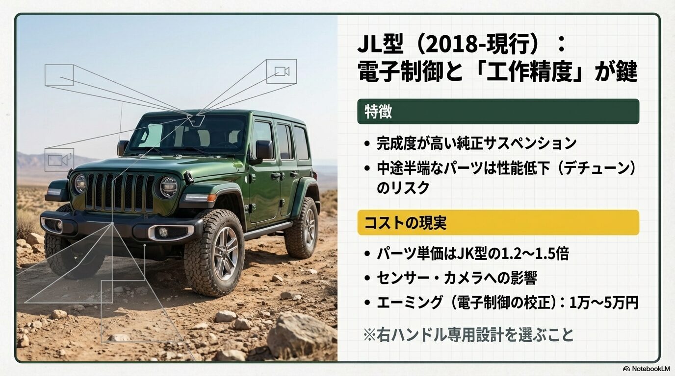 2018年に登場した現行JL型は、一見するとJK型と似た構造に見えますが、中身は別物です。車体の軽量化のためにナックルなどにアルミ合金が多用されており、パーツ一つひとつに高い工作精度が求められます。また、JL型は純正状態でのサスペンションの完成度が非常に高く、中途半端な品質のパーツを組んでしまうと、純正よりも乗り心地や直進安定性が著しく低下するという「デチューン」のリスクがJK型以上に高いのが特徴です。