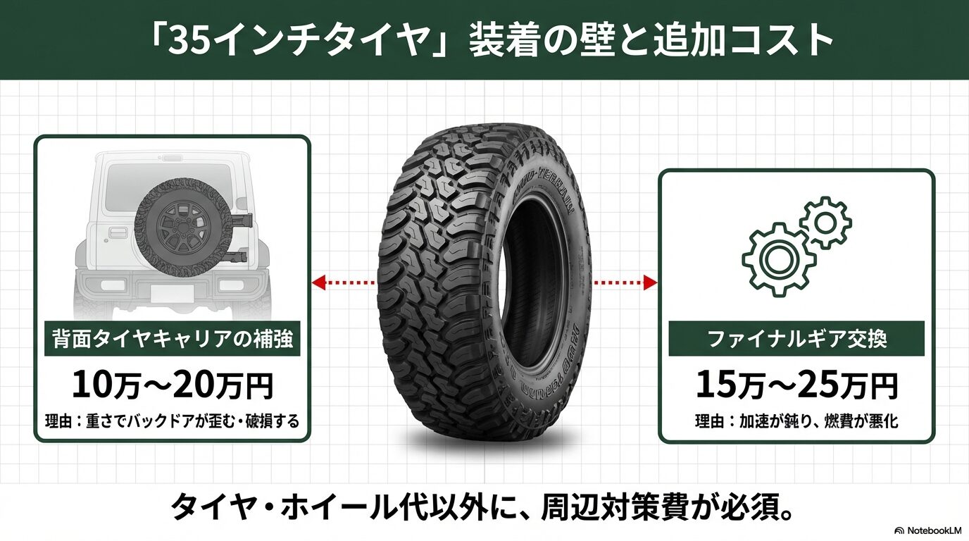 リフトアップを検討する方の多くが「35インチ以上のマッドテレーンタイヤを履きこなしたい」という夢を持っています。しかし、巨大なタイヤを装着するためには、タイヤとホイールの購入費(5本セットで25万円〜40万円)以外にも、見落としがちな追加コストが発生します。まず、ラングラーの純正スペアタイヤキャリアは、35インチ以上の重量級タイヤを支える設計にはなっていません。そのまま装着すると、振動でバックドアのヒンジが歪んだり、最悪の場合は金属疲労で破損したりする恐れがあります。そのため、ヒンジを補強するキットや、バンパー直付けのタイヤキャリア(約10万円〜20万円)への交換が必須となります。