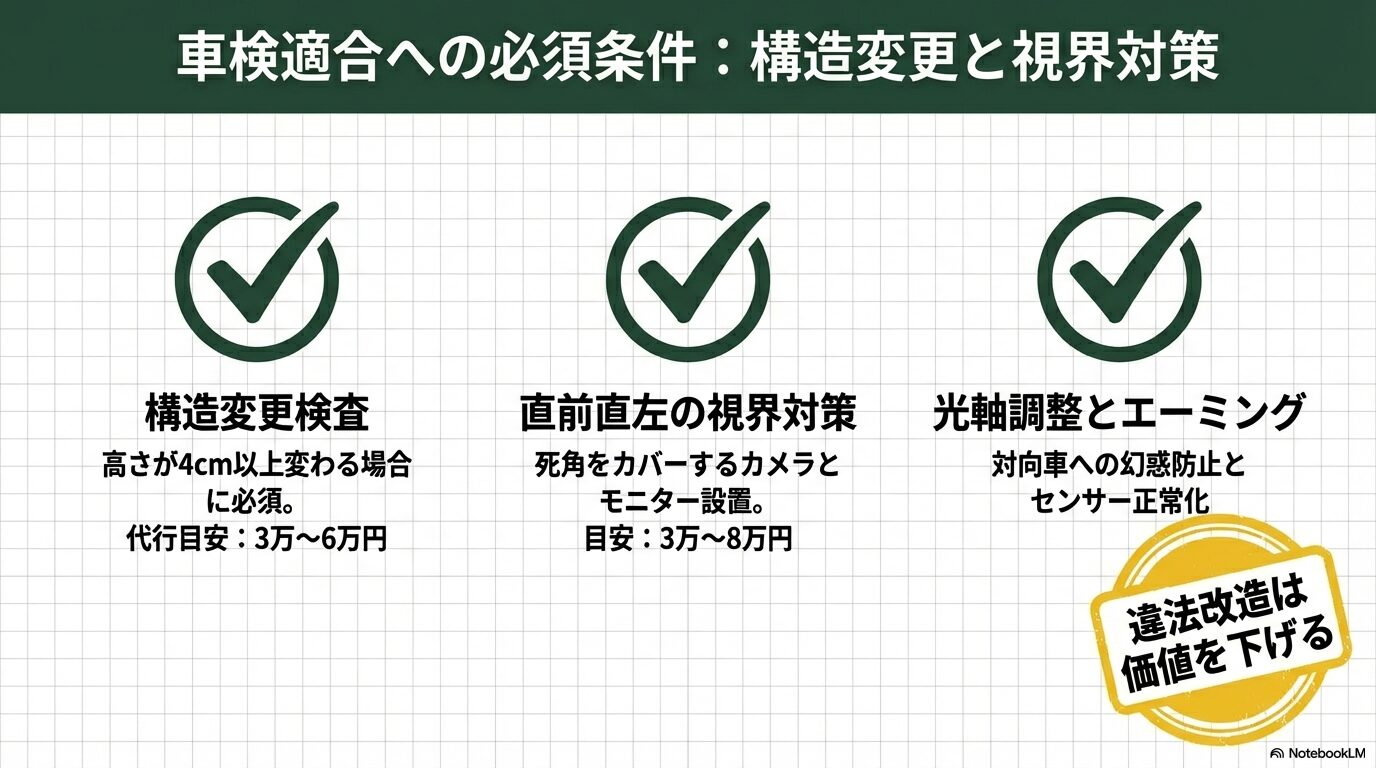 - 車検適合に欠かせない構造変更や視界基準への対応費用