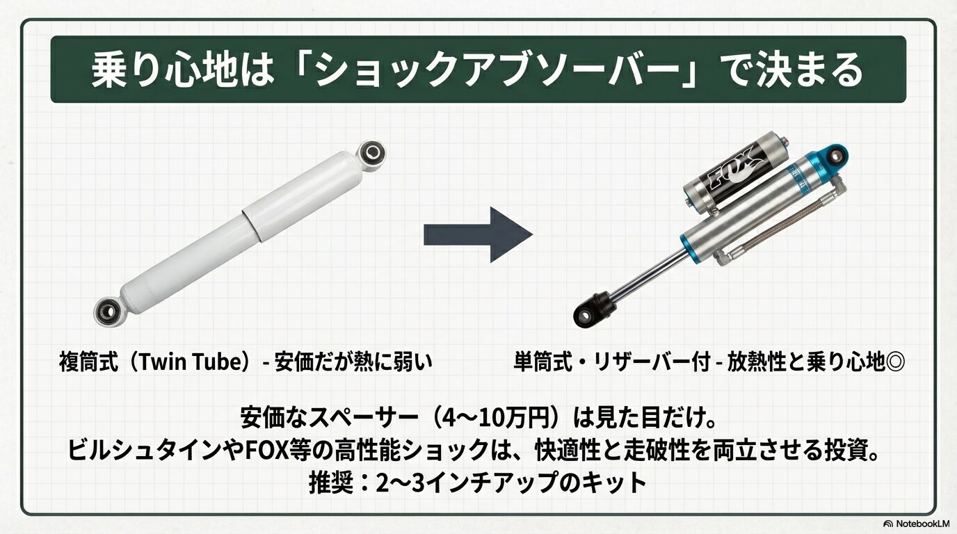 リフトアップをすると「乗り心地が悪くなる」というイメージを持つ方もいるかもしれませんが、それは適切なショックアブソーバーを選んでいない場合に起こります。ショックアブソーバーは路面からの衝撃をいなす重要な役割を担っており、キット全体の価格差の大部分はこのパーツの性能に起因するといっても過言ではありません。安価なキットに付属する「複筒式(ツインチューブ)」は、構造がシンプルなためコストを抑えられますが、長時間の走行で内部のオイルが発熱しやすく、減衰力が低下する「フェード現象」が起こりやすいというデメリットがあります。